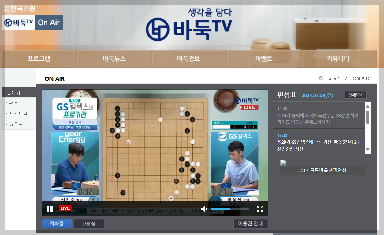 바둑 TV 생중계 및 다시 보기는 아래 버튼을 통해 바로 시청할 수 있습니다.