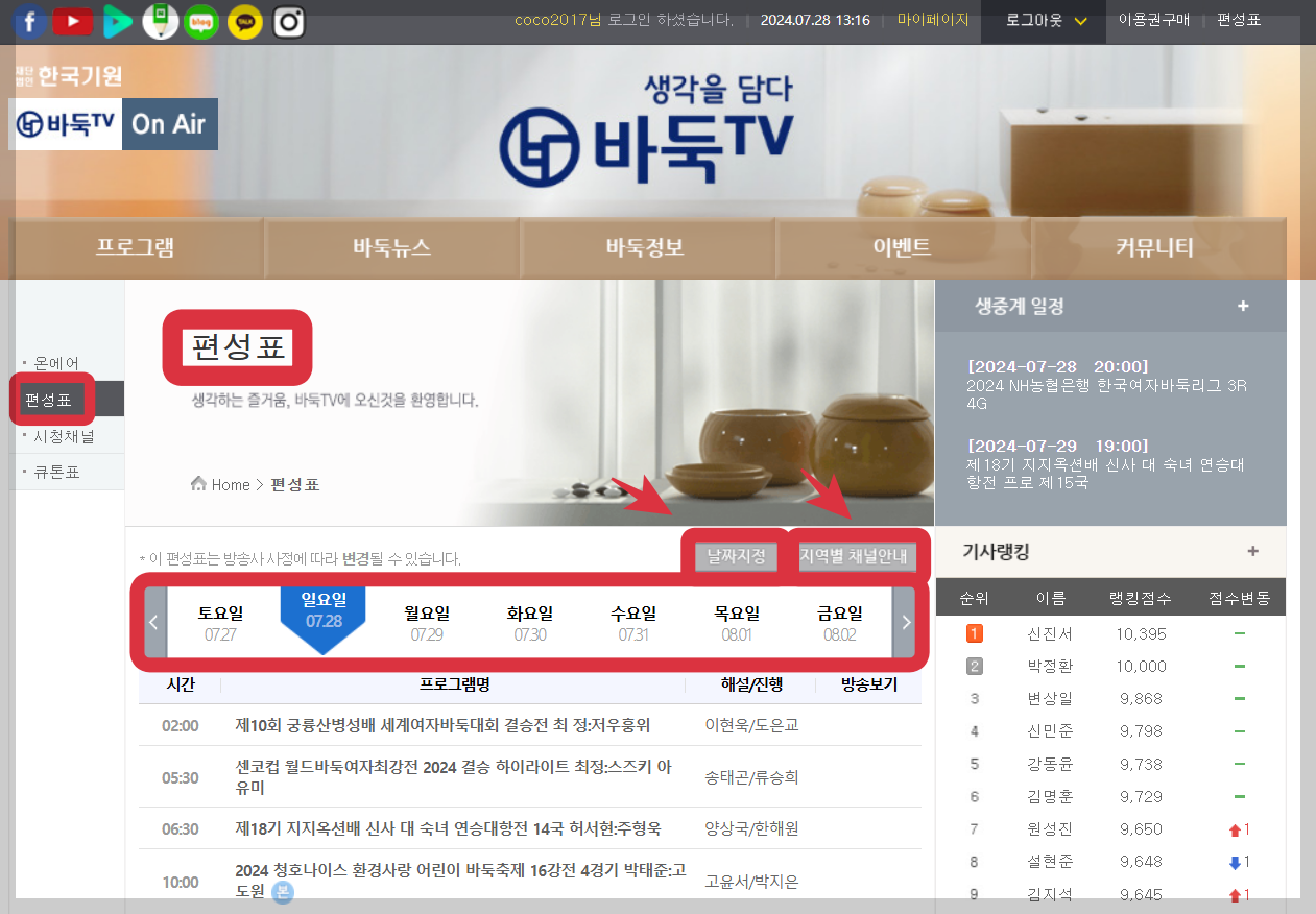 4. 바둑TV의 편성표를 선택합니다. 날짜지정과 지역별 채널안내가 가능하니 보고 싶은 경기를 선택하여 보실 수 있습니다.