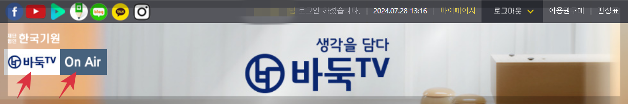 3. 홈페이지 죄측 상단에 있는 바둑 TV와 On Air 중 On Air를 선택합니다.