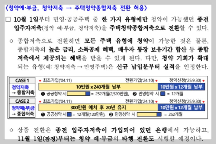 - 10월 1일 시행 : 민영고 공공주택 중 한 가지 유형에만 청약 가능했던 종전입주자저축을 주택청약 종합저축으로 전환 가능