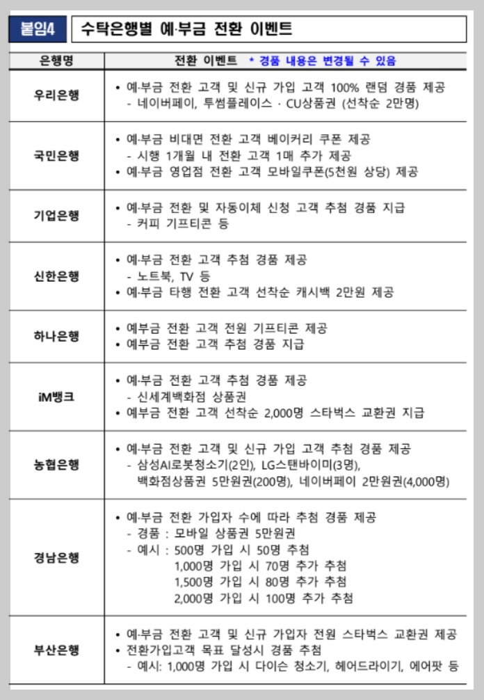 기존 은행에서 전환해지 신청 및 동의서를 작성하고 전환해지 당일을 포함한 20 영업일 이내에 희망 은행에서 전환가입 신청서를 제출해야 합니다. 은행별 이벤트도 예정되어 있으니 이 부분도 한번 체크해 보시면 좋을 것 같습니다.
