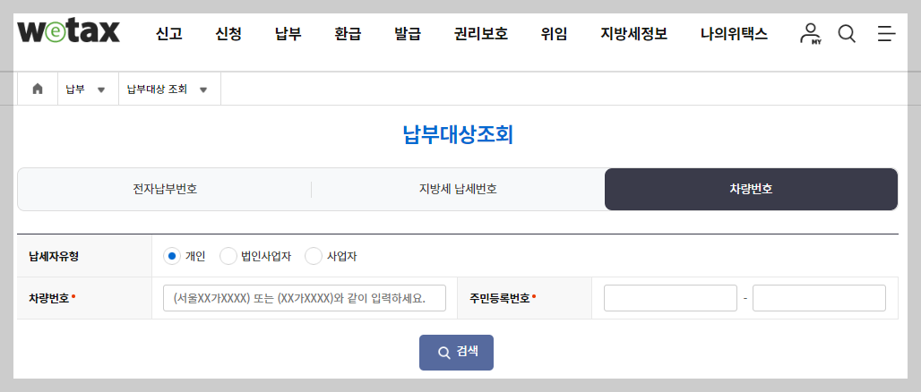 Wetax 홈페이지에 접속하신 후, 공동/공인인증서 또는 간편 인증을 이용해 로그인하세요. 로그인 후 상단 메뉴의 '결제' 섹션으로 이동하세요. '결제문의'에서 차량번호를 선택하세요. 차량등록번호와 주민등록번호를 입력하신 후, 검색 버튼을 클릭하시면 주차위반 과태료 내역을 보실 수 있습니다.