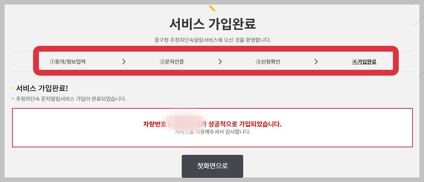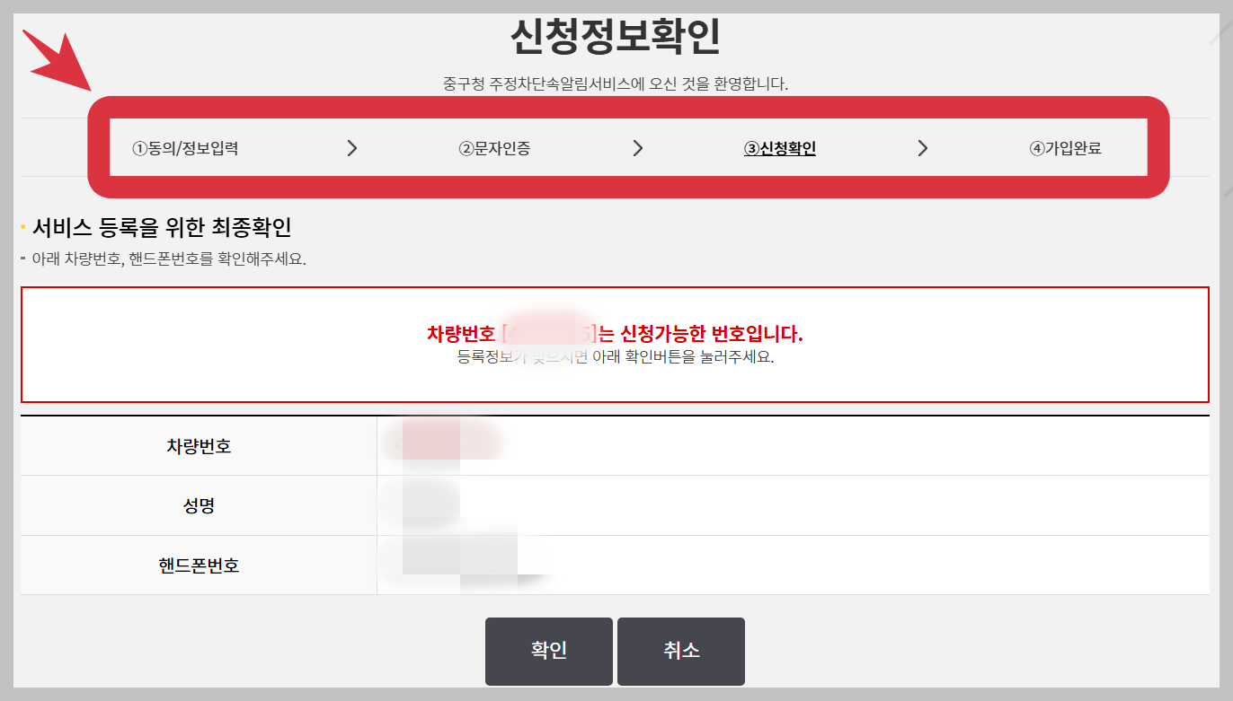 3) 그 후 차량 번호와 휴대폰 번호를 입력하면, 휴대폰을 통해 발송되는 인증 문자를 확인하고 신청을 완료할 수 있습니다. 신청이 완료되면 주정차 단속 문자 알림 서비스를 통해 안내 문자를 손쉽게 받아볼 수 있습니다.