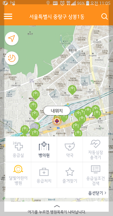 ▶️ 앱의 메인 화면에서 '응급실 찾기'나 '병원 검색' 기능을 선택해 가까운 응급실 및 당번 병원을 검색합니다. 위치에 따라 자동으로 가까운 병원 목록이 표시됩니다.