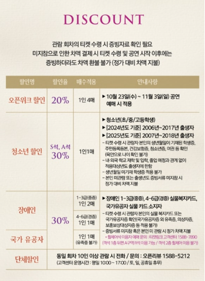 - 청소년 할인: S/A석에 한해 청소년에게 30% 할인이 적용됩니다.