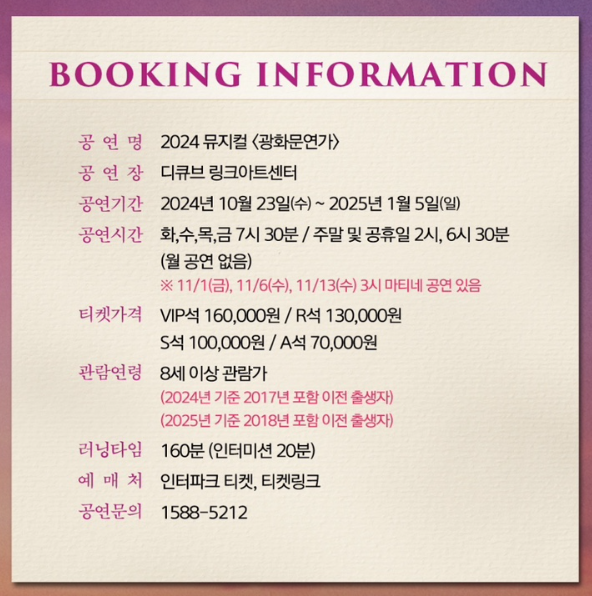 뮤지컬 "광화문연가"는 감동적인 무대와 함께 잊지 못할 추억을 선사할 것입니다. 지금 바로 티켓을 예매하고 그 특별한 순간을 경험해 보세요!