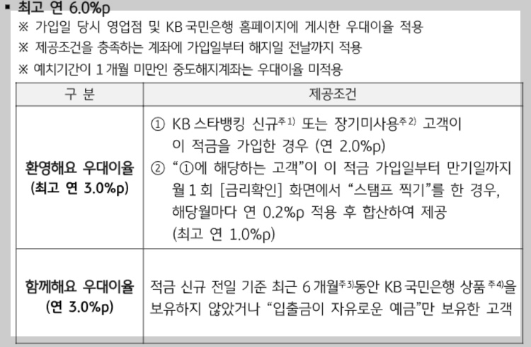'KB 스타뱅킹 신규 또는 장기미사용 고객'일 경우 기본금리 2%에 추가로 2% p, 여기에 신규 또는 장기미사용 고객이 적금 가입일부터 만기일까지 월 1회 (금리확인) 화면에서 '스탬프 찍기'활동에 따라 최고 연 1% p, 최근 6개월 동안 상품 신규 및 보유 이력이 없을 경우 추가로 연 3%를 제공한다고 합니다.