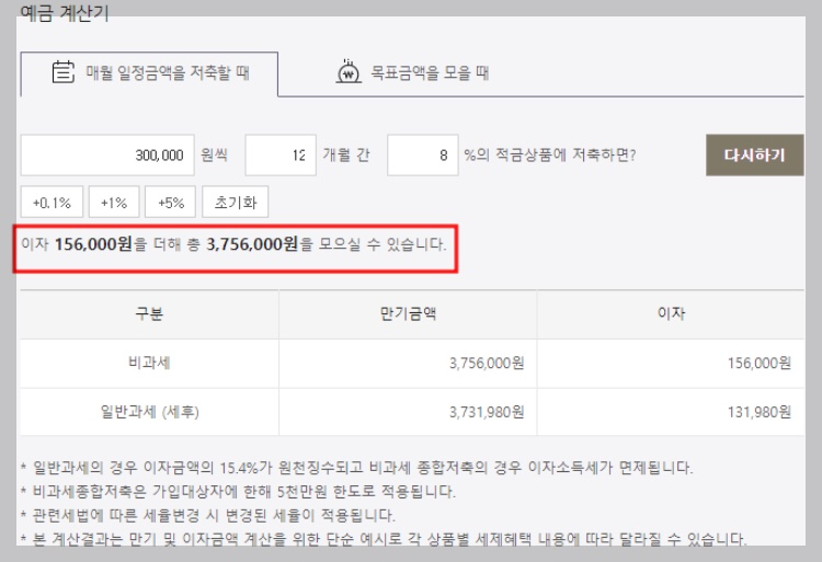 👉최대 8% 금리로 30만 원씩 12개월간 적금을 넣을 경우, 총이자는 약 131,976원이 됩니다.