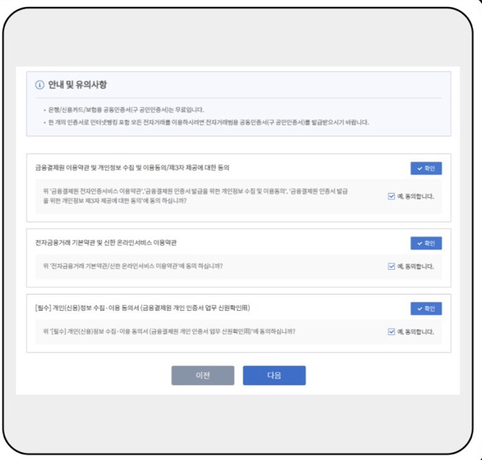 인증서 갱신 역시 발급과 동일한 과정으로 진행됩니다. 약관동의부터 진행되며 유효기간이 30일 이내인 경우 기존 만료인 + 1년간 유효한 새 인증서로 갱신된다는 점을 참고해주세요.