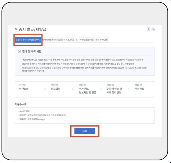 다음 화면에서는 발급 받을 수 있는 인증서 종류를 확인할 수 있습니다. 전자거래범용은 비용이 들기도 하고 무료로 발급받을 수 있는 은행/신용카드/보험용 인증서만 발급받아도 왠만한 업무들은 다 볼 수 있기 때문에 가장 첫번째 인증서를 선택하여 다음 화면으로 넘어가 주세요.