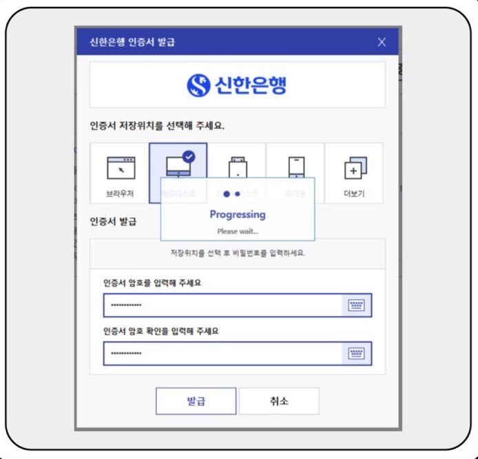 신한은행 인터넷 뱅킹 서비스에 가입하신 분들만 인증서 발급 / 재발급 서비스를 이용하실 수 있고 기존 인증서 보유여부와 유효기간 잔여여부에 따라 자동으로 신규발급과 재발급으로 구분되어 처리됩니다.