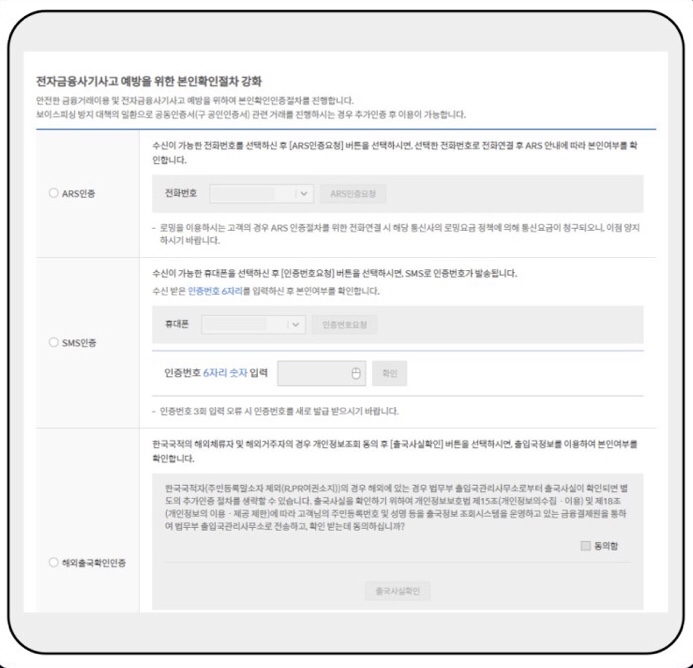 다음은 전자금융사기사고 예방을 위한 본인확인 절차를 진행하게 되면 ARS인증이나 SMS인증, 해외출국확인인증 중 편한 방법을 선택하여 진행해주세요.