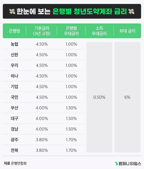 이 중 한 곳만 선택해 1인 1계좌로 신청할 수 있으며, 은행별로 금리와 우대조건이 다르니 비교 후 선택하는 것이 좋습니다.
