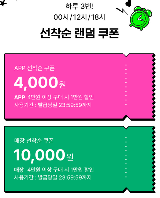 앱에서는 퀴즈, 타임딜, 한정 특가 등 다양한 추가 할인 이벤트가 자주 열리니, 자주 접속해 새로운 기회를 챙기세요. - 사전 쿠폰 적극 활용