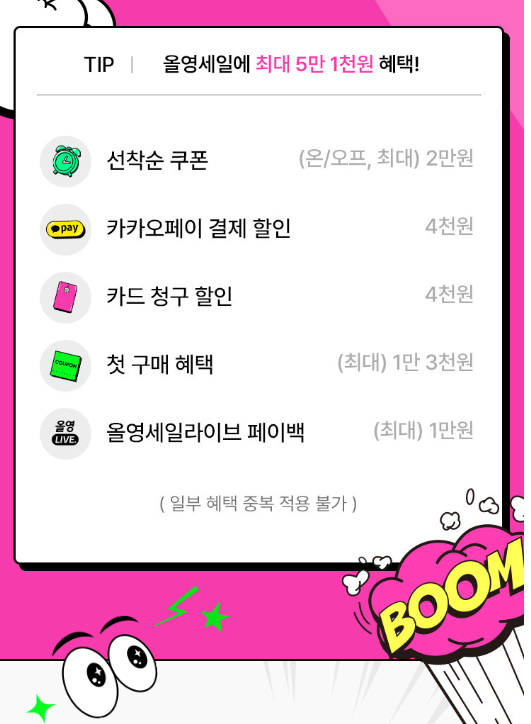 세일 오픈 전 미리 받을 수 있는 사전 쿠폰도 있습니다. 일반적으로 세일 시작 며칠 전부터 올리브영 앱이나 공식 홈페이지에서 누구나 받을 수 있도록 제공되며, 3,000원 등 일정 금액이 할인되는 쿠폰이 전원에게 지급됩니다. 단, 사용 기간이 짧으니 반드시 정해진 기간 내에 사용해야 하니 유의하세요.