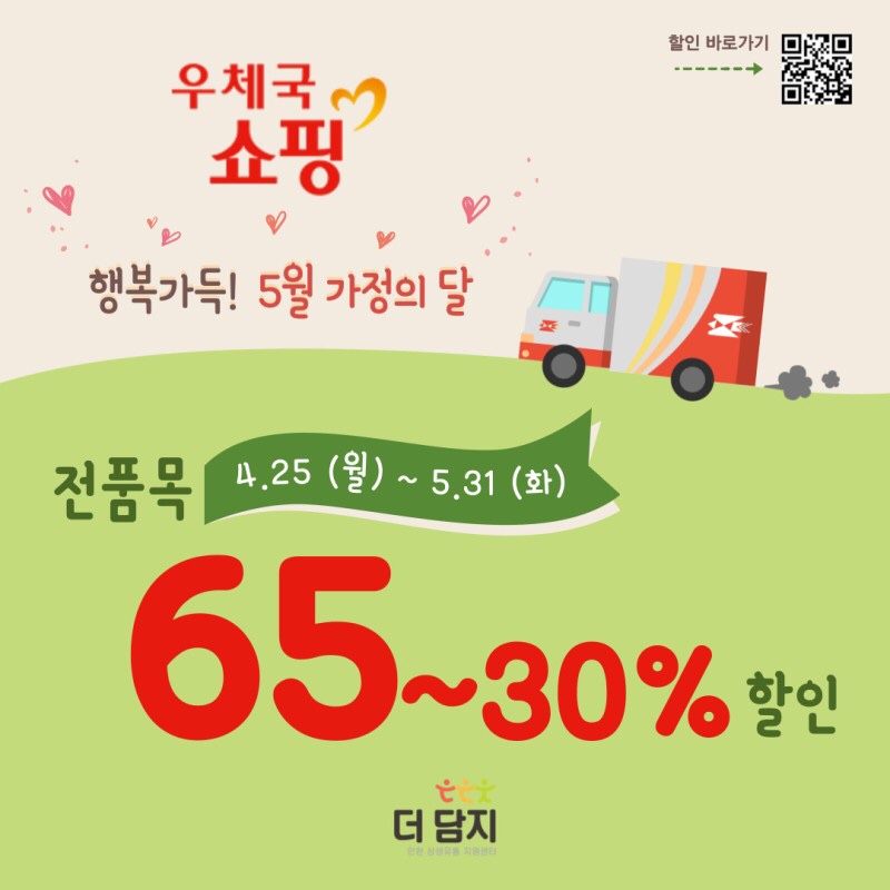 5월 가정의 달을 맞이하여 우체국 쇼핑몰 더 담자 브랜드관에서 4월 25일부터 5월 31일 한 달 동안 30%~최대 65% 할인 판촉을 진행합니다. 가정의 달을 맞이하여 가까이 있지만 바쁜 삶에 익숙하여 깜빡 잊고 지내던 소중하고 고마운 우리 가족과 이웃을 떠올려보고 이번 기회에 감사함을 전해 보는 것이 어떨까요?