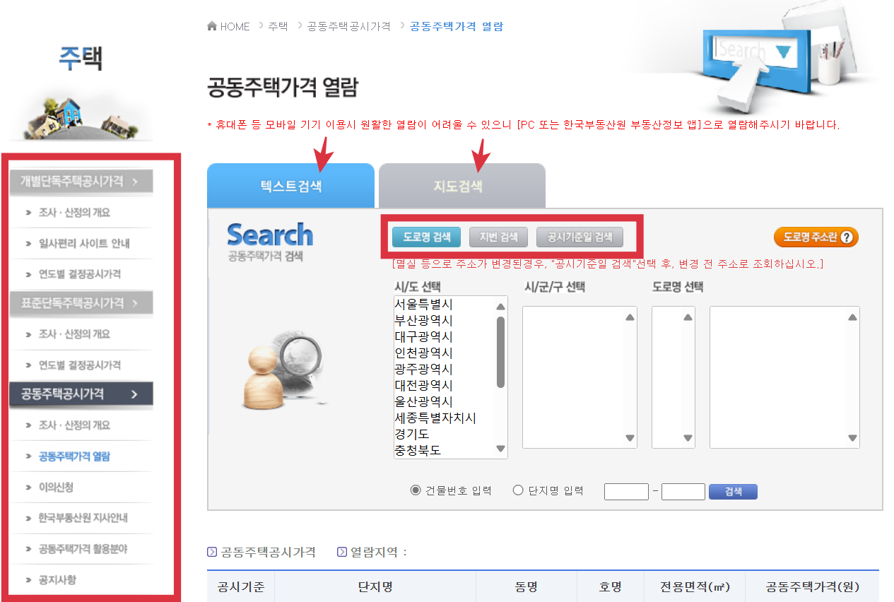1. 국토 교통부 부동산 공시가격 알리미 사이트 접속 -  '공통주택 공시가격' 항목 선택